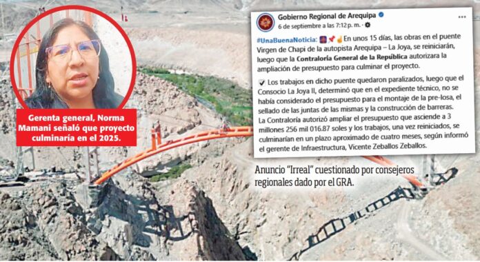 Según la gerenta general del GRA, la obra suspendida desde marzo de este año, podría reanudarse el 20 de septiembre, aunque el cronograma final apunta a la entrega del puente en junio de 2025.