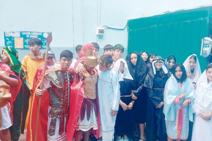 Los estudiantes de secundaria fueron los encargados de recordar el vía crucis y las 14 estaciones siendo el alumno Fernando Salas el designado para personificar a Jesús.