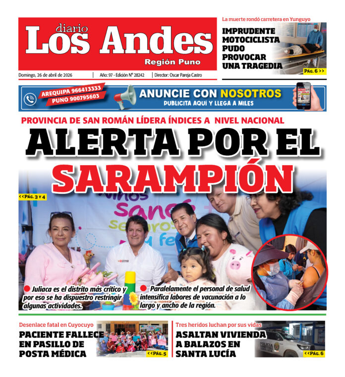 Por: admingeneral Fecha: abril 25, 2026 DIARIO DIGITAL DIARIO LOS ANDES PUNO: 26/04/26 Vistas: 6 Artículo anteriorDIARIO LOS ANDES PUNO: 25/04/26Artículo siguienteDIARIO LOS ANDES AREQUIPA: 26/04/26 admingeneralhttp://adminlosandes DEJAR UNA RESPUESTA Cancelar respuesta Comentario: Por favor, introduzca su comentario Nombre:* Introduzca aquí su nombre Correo electrónico:* Ha introducido una dirección de correo electrónico incorrecta Introduzca aquí su dirección de correo electrónico Página web: Guarda mi nombre, correo electrónico y sitio web en este navegador para la próxima vez que comente. Compartir post: FacebookTwitterPinterestWhatsApp Suscríbete Quiero entrar He leído y acepto la Política de Privacidad. Populares DIARIO LOS ANDES AREQUIPA: 26/04/26 Arequipa: Ambulantes persisten en San Camilo pese a operativos municipales Arequipa: Detienen a presunto estafador por venta de cerveza adulterada Atlético Grau y Alianza Atlético enfrentan duros retos en la fecha 12 del Apertura Perú recupera 18 bienes culturales repatriados desde Estados Unidos Más vistosMás vistos DIARIO LOS ANDES AREQUIPA: 26/04/26 admingeneral - abril 25, 2026 Arequipa: Ambulantes persisten en San Camilo pese a operativos municipales admineditor - abril 25, 2026 El comercio informal sigue presente en los alrededores del... Arequipa: Detienen a presunto estafador por venta de cerveza adulterada admineditor - abril 25, 2026 Redacción: Jessimiel Rosas Agentes de la unidad de Halcones de... Atlético Grau y Alianza Atlético enfrentan duros retos en la fecha 12 del Apertura admineditor - abril 25, 2026 Redacción: Jessimiel Rosas La fecha 12 del Torneo Apertura de...