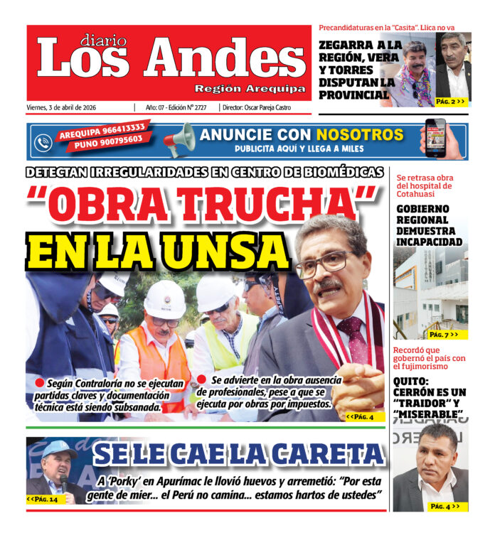 Por: Diario los Andes Fecha: abril 3, 2026 DIARIO DIGITAL DIARIO LOS ANDES AREQUIPA: 03/04/2026 Vistas: 21 Artículo anteriorDIARIO LOS ANDES PUNO: 02/04/2026Artículo siguienteDIARIO LOS ANDES PUNO: 03/04/2026 Diario los Andes DEJAR UNA RESPUESTA Cancelar respuesta Comentario: Por favor, introduzca su comentario Nombre:* Introduzca aquí su nombre Correo electrónico:* Ha introducido una dirección de correo electrónico incorrecta Introduzca aquí su dirección de correo electrónico Página web: Guarda mi nombre, correo electrónico y sitio web en este navegador para la próxima vez que comente. Compartir post: FacebookTwitterPinterestWhatsApp Suscríbete Quiero entrar He leído y acepto la Política de Privacidad. Populares DIARIO LOS ANDES PUNO: 03/04/2026 Viajar desde Arequipa cuesta el doble en feriado largo Congestión en salida de Arequipa hacia la Panamericana Sur Conflicto en Río Seco por ocupación de espacios en Semana Santa Iglesia Católica abre canal de escucha para víctimas del Sodalicio en el Perú Más vistosMás vistos DIARIO LOS ANDES PUNO: 03/04/2026 Diario los Andes - abril 3, 2026 Viajar desde Arequipa cuesta el doble en feriado largo Diario los Andes - abril 2, 2026 Los precios de los pasajes interprovinciales en el Terminal... Congestión en salida de Arequipa hacia la Panamericana Sur Diario los Andes - abril 2, 2026 Una intensa congestión vehicular se registra en la salida... Conflicto en Río Seco por ocupación de espacios en Semana Santa Diario los Andes - abril 2, 2026 Un enfrentamiento entre comerciantes se registró en el terminal...