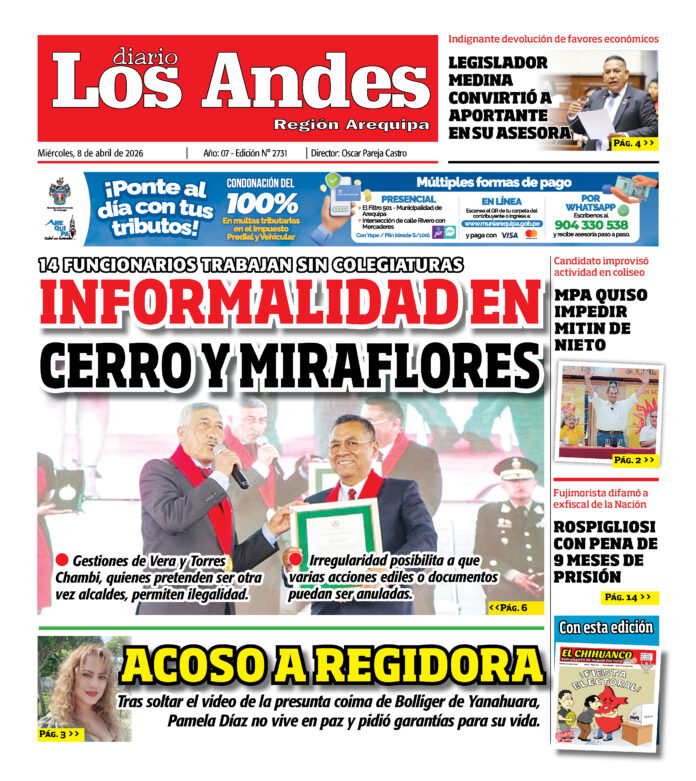Por: admingeneral Fecha: abril 8, 2026 DIARIO DIGITAL DIARIO LOS ANDES AREQUIPA: 08/04/2026 Vistas: 124 Artículo anteriorDIARIO LOS ANDES PUNO: 08/04/2026 admingeneralhttp://adminlosandes DEJAR UNA RESPUESTA Cancelar respuesta Comentario: Por favor, introduzca su comentario Nombre:* Introduzca aquí su nombre Correo electrónico:* Ha introducido una dirección de correo electrónico incorrecta Introduzca aquí su dirección de correo electrónico Página web: Guarda mi nombre, correo electrónico y sitio web en este navegador para la próxima vez que comente. Compartir post: FacebookTwitterPinterestWhatsApp Suscríbete Quiero entrar He leído y acepto la Política de Privacidad. Populares Óscar Zea se hizo millonario tras voltearse políticamente Sentencian a 35 años de cárcel a soldado por crimen de madre e hijo DIARIO LOS ANDES PUNO: 08/04/2026 MINEDU suspende clases en colegios que serán locales de votación por elecciones Juliaca: Extensas filas en RENIEC por entrega de DNI antes de elecciones Más vistosMás vistos Óscar Zea se hizo millonario tras voltearse políticamente admineditor - abril 8, 2026 Óscar Zea Choquechambi disfruta de sus últimos sueldos como... Sentencian a 35 años de cárcel a soldado por crimen de madre e hijo admineditor - abril 8, 2026 El Juzgado Penal Colegiado Supraprovincial de San Román, con... DIARIO LOS ANDES PUNO: 08/04/2026 admingeneral - abril 8, 2026 MINEDU suspende clases en colegios que serán locales de votación por elecciones admineditor - abril 7, 2026 Redacción: Yudith Veronica Taco Huallpa El Ministerio de Educación...