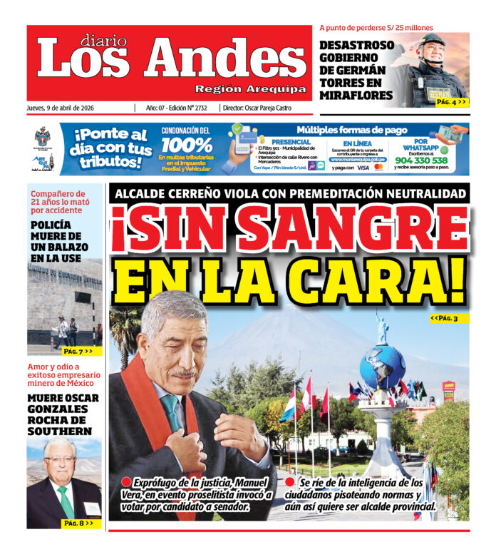 Por: admingeneral Fecha: abril 9, 2026 DIARIO DIGITAL DIARIO LOS ANDES AREQUIPA: 09/04/2026 Vistas: 12 Artículo anteriorDIARIO LOS ANDES AREQUIPA: 08/04/2026Artículo siguienteDIARIO LOS ANDES PUNO: 09/04/2026 admingeneralhttp://adminlosandes DEJAR UNA RESPUESTA Cancelar respuesta Comentario: Por favor, introduzca su comentario Nombre:* Introduzca aquí su nombre Correo electrónico:* Ha introducido una dirección de correo electrónico incorrecta Introduzca aquí su dirección de correo electrónico Página web: Guarda mi nombre, correo electrónico y sitio web en este navegador para la próxima vez que comente. Compartir post: FacebookTwitterPinterestWhatsApp Suscríbete Quiero entrar He leído y acepto la Política de Privacidad. Populares DIARIO LOS ANDES PUNO: 09/04/2026 Autoridades de salud de Perú y Bolivia coordinan acciones para frenar el sarampión en la frontera Se incrementan hurtos en la región Arequipa Rospigliosi condenado por “terruquear” Arequipa: Regidora que denunció a Bolliger pide garantías Más vistosMás vistos DIARIO LOS ANDES PUNO: 09/04/2026 admingeneral - abril 9, 2026 Autoridades de salud de Perú y Bolivia coordinan acciones para frenar el sarampión en la frontera admineditor - abril 8, 2026 Ante la preocupación por el incremento de casos de... Se incrementan hurtos en la región Arequipa admineditor - abril 8, 2026 Redacción: Diario Los Andes Pese a la reducción de... Rospigliosi condenado por “terruquear” admineditor - abril 8, 2026 Redacción: Diario Los Andes El presidente del Congreso, Fernando...