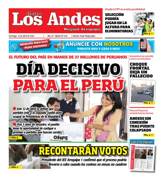 Por: admingeneral Fecha: abril 11, 2026 DIARIO DIGITAL DIARIO LOS ANDES AREQUIPA: 12/04/2026 Vistas: 7 Artículo anteriorDIARIO LOS ANDES PUNO: 12/04/26 admingeneralhttp://adminlosandes DEJAR UNA RESPUESTA Cancelar respuesta Comentario: Por favor, introduzca su comentario Nombre:* Introduzca aquí su nombre Correo electrónico:* Ha introducido una dirección de correo electrónico incorrecta Introduzca aquí su dirección de correo electrónico Página web: Guarda mi nombre, correo electrónico y sitio web en este navegador para la próxima vez que comente. Compartir post: FacebookTwitterPinterestWhatsApp Suscríbete Quiero entrar He leído y acepto la Política de Privacidad. Populares DIARIO LOS ANDES PUNO: 12/04/26 Arequipa: Precio del balón supera los S/50 en últimas semanas Arequipa: Detienen a adulto mayor acusado de tocamientos indebidos a menor Puno: Alertan incremento de temperatura este domingo de elecciones generales Choque frontal en Arequipa–Yura deja un fallecido y dos heridas en Apipa Más vistosMás vistos DIARIO LOS ANDES PUNO: 12/04/26 admingeneral - abril 11, 2026 Arequipa: Precio del balón supera los S/50 en últimas semanas admineditor - abril 11, 2026 Redacción: Jessimiel Rosas En el distrito de Cayma, el precio... Arequipa: Detienen a adulto mayor acusado de tocamientos indebidos a menor admineditor - abril 11, 2026 Redacción: Jessimiel Rosas Un hombre de 76 años fue detenido... Puno: Alertan incremento de temperatura este domingo de elecciones generales admineditor - abril 11, 2026 De acuerdo al Boletín N.º 218–2026 del Senamhi, este...