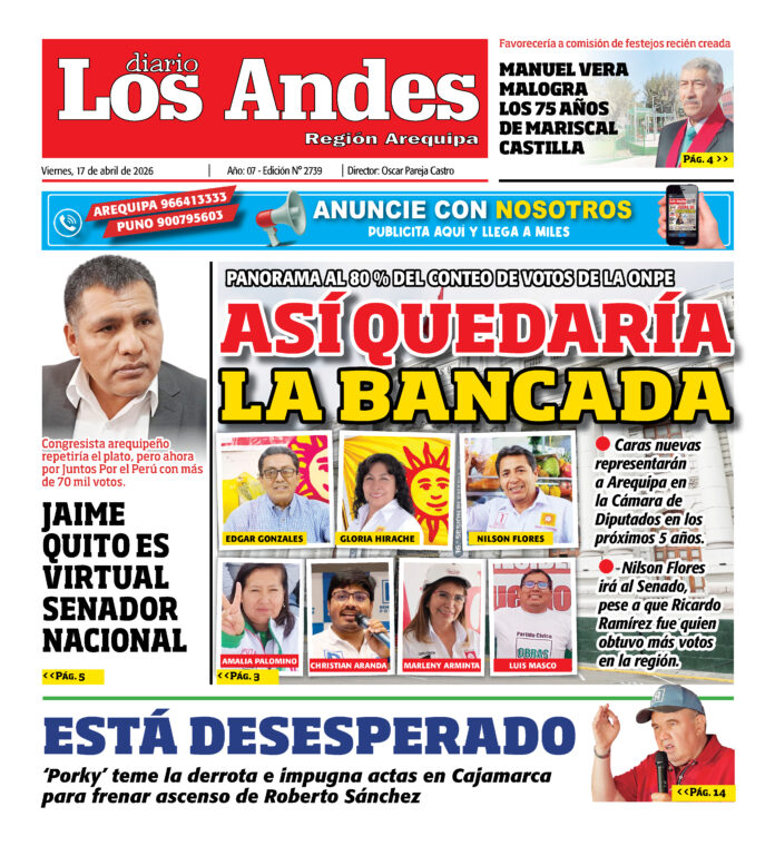 Por: admingeneral Fecha: abril 17, 2026 DIARIO DIGITAL DIARIO LOS ANDES AREQUIPA: 17/04/2026 Vistas: 10 Artículo anteriorDIARIO LOS ANDES PUNO: 16/04/2026Artículo siguienteDIARIO LOS ANDES PUNO: 17/04/2026 admingeneralhttp://adminlosandes DEJAR UNA RESPUESTA Cancelar respuesta Comentario: Por favor, introduzca su comentario Nombre:* Introduzca aquí su nombre Correo electrónico:* Ha introducido una dirección de correo electrónico incorrecta Introduzca aquí su dirección de correo electrónico Página web: Guarda mi nombre, correo electrónico y sitio web en este navegador para la próxima vez que comente. Compartir post: FacebookTwitterPinterestWhatsApp Suscríbete Quiero entrar He leído y acepto la Política de Privacidad. Populares DIARIO LOS ANDES PUNO: 17/04/2026 JNE recibió más de 5 mil solicitudes de dispensa y justificación electoral Incautan mercadería de contrabando en la vía Moho-Huancané UNA Puno acumula deuda por arbitrios municipales por cerca a S/180 mil Denunció a policías por robo y coima en Cayma Más vistosMás vistos DIARIO LOS ANDES PUNO: 17/04/2026 admingeneral - abril 17, 2026 JNE recibió más de 5 mil solicitudes de dispensa y justificación electoral admineditor - abril 16, 2026 El Jurado Nacional de Elecciones (JNE) recibió un total... Incautan mercadería de contrabando en la vía Moho-Huancané admineditor - abril 16, 2026 Personal del Área de Policía Fiscal Juliaca ejecutó el... UNA Puno acumula deuda por arbitrios municipales por cerca a S/180 mil admineditor - abril 16, 2026 La Universidad Nacional del Altiplano de Puno mantiene una...