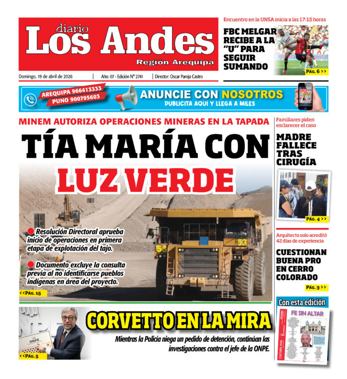 Por: admingeneral Fecha: abril 18, 2026 DIARIO DIGITAL DIARIO LOS ANDES AREQUIPA: 19/04/26 Vistas: 9 Artículo anteriorDIARIO LOS ANDES PUNO: 18/04/2026Artículo siguienteDIARIO LOS ANDES PUNO: 19/04/26 admingeneralhttp://adminlosandes DEJAR UNA RESPUESTA Cancelar respuesta Comentario: Por favor, introduzca su comentario Nombre:* Introduzca aquí su nombre Correo electrónico:* Ha introducido una dirección de correo electrónico incorrecta Introduzca aquí su dirección de correo electrónico Página web: Guarda mi nombre, correo electrónico y sitio web en este navegador para la próxima vez que comente. Compartir post: FacebookTwitterPinterestWhatsApp Suscríbete Quiero entrar He leído y acepto la Política de Privacidad. Populares DIARIO LOS ANDES PUNO: 19/04/26 Arequipa: Cierre temporal en calle Peral por obras de mejoramiento vial Operativo en Juliaca permite desarticular banda criminal y rescatar a tres mujeres Arequipa: Cerrarán puente Bolognesi por rodaje de película “Coquito” Arequipa: Refuerzan control del transporte hacia el Santuario de Chapi Más vistosMás vistos DIARIO LOS ANDES PUNO: 19/04/26 admingeneral - abril 18, 2026 Arequipa: Cierre temporal en calle Peral por obras de mejoramiento vial admineditor - abril 18, 2026 Redacción: Jessimiel Rosas Desde la noche del viernes 17 de... Operativo en Juliaca permite desarticular banda criminal y rescatar a tres mujeres admineditor - abril 18, 2026 Un operativo policial en la ciudad #Juliaca terminó con... Arequipa: Cerrarán puente Bolognesi por rodaje de película “Coquito” admineditor - abril 18, 2026 Redacción: Jessimiel Rosas El tránsito vehicular en el Puente Bolognesi...