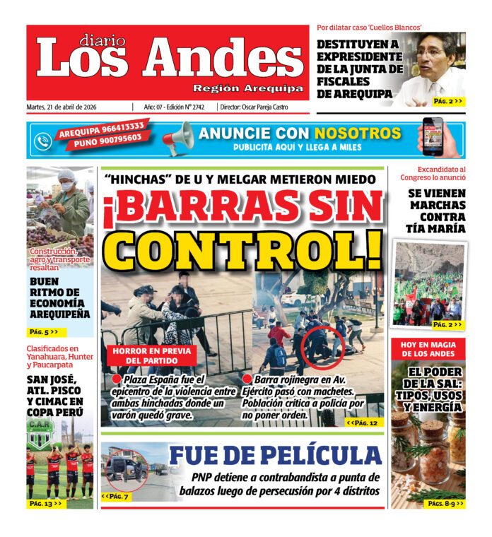 Por: admingeneral Fecha: abril 21, 2026 DIARIO DIGITAL DIARIO LOS ANDES AREQUIPA: 21/04/26 Vistas: 14 Artículo anteriorSemanario Los Andes 20/04/2026Artículo siguienteDIARIO LOS ANDES PUNO: 21/04/26 admingeneralhttp://adminlosandes DEJAR UNA RESPUESTA Cancelar respuesta Comentario: Por favor, introduzca su comentario Nombre:* Introduzca aquí su nombre Correo electrónico:* Ha introducido una dirección de correo electrónico incorrecta Introduzca aquí su dirección de correo electrónico Página web: Guarda mi nombre, correo electrónico y sitio web en este navegador para la próxima vez que comente. Compartir post: FacebookTwitterPinterestWhatsApp Suscríbete Quiero entrar He leído y acepto la Política de Privacidad. Populares DIARIO LOS ANDES PUNO: 21/04/26 Arequipa: Persecución con disparos deja un detenido y dos heridos Perú suma 20 medallas en los juegos suramericanos de la juventud Panamá 2026 Incautan más de 100 kilos de marihuana en operativo en Cabanillas Adulto mayor gravemente herido tras accidente en Ilave Más vistosMás vistos DIARIO LOS ANDES PUNO: 21/04/26 admingeneral - abril 21, 2026 Arequipa: Persecución con disparos deja un detenido y dos heridos admineditor - abril 20, 2026 Redacción: Jessimiel Rosas Una persecución policial con disparos se registró... Perú suma 20 medallas en los juegos suramericanos de la juventud Panamá 2026 admineditor - abril 20, 2026 La primera semana de los IV Juegos Suramericanos de... Incautan más de 100 kilos de marihuana en operativo en Cabanillas admineditor - abril 20, 2026 En un operativo realizado durante la madrugada del último...