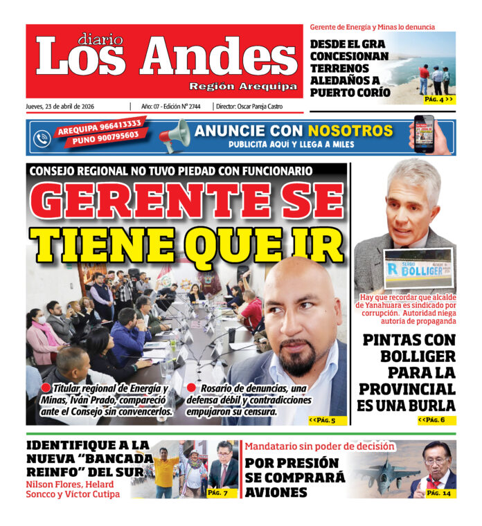 Por: admingeneral Fecha: abril 23, 2026 DIARIO DIGITAL DIARIO LOS ANDES AREQUIPA: 23/04/26 Vistas: 19 Artículo anteriorDIARIO LOS ANDES AREQUIPA: 22/04/26Artículo siguienteDIARIO LOS ANDES PUNO: 23/04/26 admingeneralhttp://adminlosandes DEJAR UNA RESPUESTA Cancelar respuesta Comentario: Por favor, introduzca su comentario Nombre:* Introduzca aquí su nombre Correo electrónico:* Ha introducido una dirección de correo electrónico incorrecta Introduzca aquí su dirección de correo electrónico Página web: Guarda mi nombre, correo electrónico y sitio web en este navegador para la próxima vez que comente. Compartir post: FacebookTwitterPinterestWhatsApp Suscríbete Quiero entrar He leído y acepto la Política de Privacidad. Populares DIARIO LOS ANDES PUNO: 23/04/26 Arequipa: Padre encuentra a su hijo desaparecido en la calle tras un mes de búsqueda Investigan presunta red de corrupción en el Municipio de Puno Ejecutarán acondicionamiento térmico en 10 colegios de la región UGEL San Román expone a los niños al sarampión Más vistosMás vistos DIARIO LOS ANDES PUNO: 23/04/26 admingeneral - abril 23, 2026 Arequipa: Padre encuentra a su hijo desaparecido en la calle tras un mes de búsqueda admineditor - abril 22, 2026 Redacción: Jessimiel Rosas Un padre encontró a su hijo desaparecido... Investigan presunta red de corrupción en el Municipio de Puno admineditor - abril 22, 2026 La Fiscalía Provincial Especializada en Delitos de Corrupción de... Ejecutarán acondicionamiento térmico en 10 colegios de la región admineditor - abril 22, 2026 El Programa Nacional de Infraestructura Educativa (Pronied), ejecutará intervenciones...