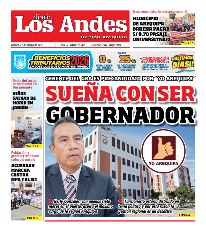 Por: Diario los Andes Fecha: marzo 27, 2026 DIARIO DIGITAL DIARIO LOS ANDES AREQUIPA: 27/03/26 Vistas: 27 Artículo anteriorDIARIO LOS ANDES PUNO: 26/03/26Artículo siguienteDIARIO LOS ANDES PUNO: 27/03/26 Diario los Andes DEJAR UNA RESPUESTA Cancelar respuesta Comentario: Por favor, introduzca su comentario Nombre:* Introduzca aquí su nombre Correo electrónico:* Ha introducido una dirección de correo electrónico incorrecta Introduzca aquí su dirección de correo electrónico Página web: Guarda mi nombre, correo electrónico y sitio web en este navegador para la próxima vez que comente. Compartir post: FacebookTwitterPinterestWhatsApp Suscríbete Quiero entrar He leído y acepto la Política de Privacidad. Populares DIARIO LOS ANDES PUNO: 27/03/26 Jurado responsabiliza a Meta y YouTube por diseño adictivo y daño a menor Arequipa: Hallan droga oculta en ducto de desagüe del penal de Socabaya Paucarpata: PNP detiene a sujeto por tocamientos indebidos en transporte público Vecinos y escolares arriesgan su vida al cruzar torrentera El Chullo Más vistosMás vistos DIARIO LOS ANDES PUNO: 27/03/26 Diario los Andes - marzo 27, 2026 Jurado responsabiliza a Meta y YouTube por diseño adictivo y daño a menor Diario los Andes - marzo 26, 2026 Un jurado de Los Ángeles declaró responsables a Meta... Arequipa: Hallan droga oculta en ducto de desagüe del penal de Socabaya Diario los Andes - marzo 26, 2026 Agentes del INPE hallaron droga oculta en un ducto... Paucarpata: PNP detiene a sujeto por tocamientos indebidos en transporte público Diario los Andes - marzo 26, 2026 Efectivos de la Policía Nacional del Perú detuvieron a...