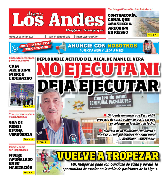 Por: admingeneral Fecha: abril 28, 2026 DIARIO DIGITAL DIARIO LOS ANDES AREQUIPA: 28/04/26 Vistas: 16 Artículo anteriorSemanario Los Andes 27/04/2026Artículo siguienteDIARIO LOS ANDES PUNO: 28/04/26 admingeneralhttp://adminlosandes DEJAR UNA RESPUESTA Cancelar respuesta Comentario: Por favor, introduzca su comentario Nombre:* Introduzca aquí su nombre Correo electrónico:* Ha introducido una dirección de correo electrónico incorrecta Introduzca aquí su dirección de correo electrónico Página web: Guarda mi nombre, correo electrónico y sitio web en este navegador para la próxima vez que comente. Compartir post: FacebookTwitterPinterestWhatsApp Suscríbete Quiero entrar He leído y acepto la Política de Privacidad. Populares DIARIO LOS ANDES PUNO: 28/04/26 Detienen a presuntos integrantes de la banda “Los Pepas de Circunvalación” Accidente en la vía Yunguyo-Tinicachi deja un fallecido y menor grave Choque frontal entre camioneta y moto lineal deja un herido de gravedad Arequipa: Exposición “Soliloquio de una soledad” sobre la identidad y el cuerpo Más vistosMás vistos DIARIO LOS ANDES PUNO: 28/04/26 admingeneral - abril 28, 2026 Detienen a presuntos integrantes de la banda “Los Pepas de Circunvalación” admineditor - abril 27, 2026 En un operativo ejecutado en Juliaca, agentes del Escuadrón... Accidente en la vía Yunguyo-Tinicachi deja un fallecido y menor grave admineditor - abril 27, 2026 Esta madrugada, se registró una accidente de tránsito en... Choque frontal entre camioneta y moto lineal deja un herido de gravedad admineditor - abril 27, 2026 Un motociclista resultó gravemente herido tras un choque frontal...