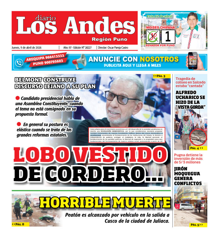 Por: admingeneral Fecha: abril 9, 2026 DIARIO DIGITAL DIARIO LOS ANDES PUNO: 09/04/2026 Vistas: 9 Artículo anteriorDIARIO LOS ANDES AREQUIPA: 09/04/2026 admingeneralhttp://adminlosandes DEJAR UNA RESPUESTA Cancelar respuesta Comentario: Por favor, introduzca su comentario Nombre:* Introduzca aquí su nombre Correo electrónico:* Ha introducido una dirección de correo electrónico incorrecta Introduzca aquí su dirección de correo electrónico Página web: Guarda mi nombre, correo electrónico y sitio web en este navegador para la próxima vez que comente. Compartir post: FacebookTwitterPinterestWhatsApp Suscríbete Quiero entrar He leído y acepto la Política de Privacidad. Populares DIARIO LOS ANDES AREQUIPA: 09/04/2026 Autoridades de salud de Perú y Bolivia coordinan acciones para frenar el sarampión en la frontera Se incrementan hurtos en la región Arequipa Rospigliosi condenado por “terruquear” Arequipa: Regidora que denunció a Bolliger pide garantías Más vistosMás vistos DIARIO LOS ANDES AREQUIPA: 09/04/2026 admingeneral - abril 9, 2026 Autoridades de salud de Perú y Bolivia coordinan acciones para frenar el sarampión en la frontera admineditor - abril 8, 2026 Ante la preocupación por el incremento de casos de... Se incrementan hurtos en la región Arequipa admineditor - abril 8, 2026 Redacción: Diario Los Andes Pese a la reducción de... Rospigliosi condenado por “terruquear” admineditor - abril 8, 2026 Redacción: Diario Los Andes El presidente del Congreso, Fernando...