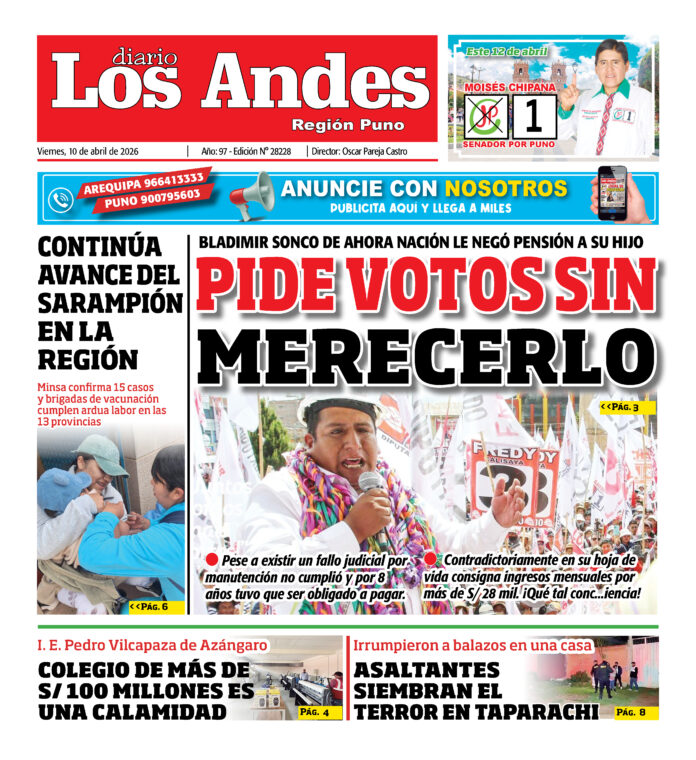 Por: admingeneral Fecha: abril 10, 2026 DIARIO DIGITAL DIARIO LOS ANDES PUNO: 10/04/2026 Vistas: 11 Artículo anteriorDIARIO LOS ANDES PUNO: 09/04/2026Artículo siguienteDIARIO LOS ANDES AREQUIPA: 10/04/2026 admingeneralhttp://adminlosandes DEJAR UNA RESPUESTA Cancelar respuesta Comentario: Por favor, introduzca su comentario Nombre:* Introduzca aquí su nombre Correo electrónico:* Ha introducido una dirección de correo electrónico incorrecta Introduzca aquí su dirección de correo electrónico Página web: Guarda mi nombre, correo electrónico y sitio web en este navegador para la próxima vez que comente. Compartir post: FacebookTwitterPinterestWhatsApp Suscríbete Quiero entrar He leído y acepto la Política de Privacidad. Populares DIARIO LOS ANDES AREQUIPA: 10/04/2026 Puno: Se hizo de la “vista gorda” ante tragedia anunciada Juliaca: Hallan sin vida a adolescente que esperaba declarar por abuso sexual Plan de gobierno de Belmont contradice su pose y discurso Puno: Afectados por contaminación del río Ramis anuncian protestas Más vistosMás vistos DIARIO LOS ANDES AREQUIPA: 10/04/2026 admingeneral - abril 10, 2026 Puno: Se hizo de la “vista gorda” ante tragedia anunciada admineditor - abril 9, 2026 Redacción: Diario Los Andes Dos informes de la Contraloría... Juliaca: Hallan sin vida a adolescente que esperaba declarar por abuso sexual admineditor - abril 9, 2026 Redacción: Jessimiel Rosas El silencio de la mañana del lunes... Plan de gobierno de Belmont contradice su pose y discurso admineditor - abril 9, 2026 Redacción: J. Carlos Flores Vargas Ricardo Belmont Cassinelli ha...