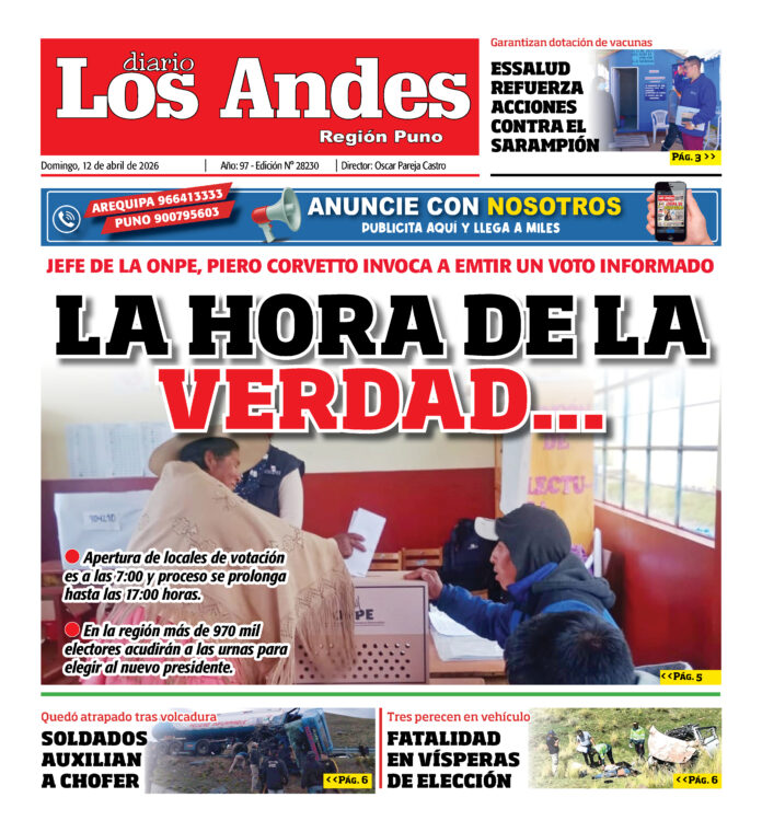 Por: admingeneral Fecha: abril 11, 2026 DIARIO DIGITAL DIARIO LOS ANDES PUNO: 12/04/26 Vistas: 4 Artículo anteriorDIARIO LOS ANDES AREQUIPA: 11/04/2026Artículo siguienteDIARIO LOS ANDES AREQUIPA: 12/04/2026 admingeneralhttp://adminlosandes DEJAR UNA RESPUESTA Cancelar respuesta Comentario: Por favor, introduzca su comentario Nombre:* Introduzca aquí su nombre Correo electrónico:* Ha introducido una dirección de correo electrónico incorrecta Introduzca aquí su dirección de correo electrónico Página web: Guarda mi nombre, correo electrónico y sitio web en este navegador para la próxima vez que comente. Compartir post: FacebookTwitterPinterestWhatsApp Suscríbete Quiero entrar He leído y acepto la Política de Privacidad. Populares DIARIO LOS ANDES AREQUIPA: 12/04/2026 Arequipa: Precio del balón supera los S/50 en últimas semanas Arequipa: Detienen a adulto mayor acusado de tocamientos indebidos a menor Puno: Alertan incremento de temperatura este domingo de elecciones generales Choque frontal en Arequipa–Yura deja un fallecido y dos heridas en Apipa Más vistosMás vistos DIARIO LOS ANDES AREQUIPA: 12/04/2026 admingeneral - abril 11, 2026 Arequipa: Precio del balón supera los S/50 en últimas semanas admineditor - abril 11, 2026 Redacción: Jessimiel Rosas En el distrito de Cayma, el precio... Arequipa: Detienen a adulto mayor acusado de tocamientos indebidos a menor admineditor - abril 11, 2026 Redacción: Jessimiel Rosas Un hombre de 76 años fue detenido... Puno: Alertan incremento de temperatura este domingo de elecciones generales admineditor - abril 11, 2026 De acuerdo al Boletín N.º 218–2026 del Senamhi, este...