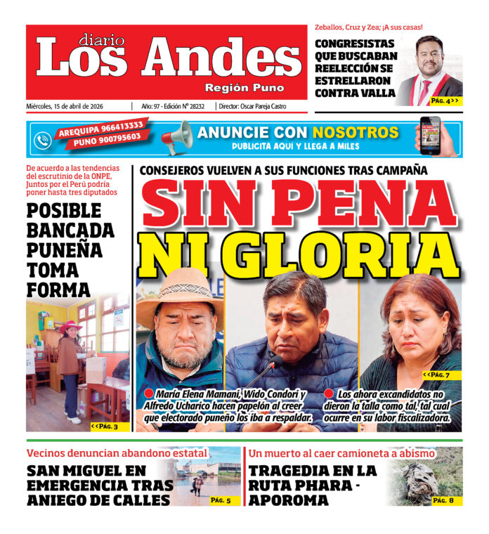 Por: admingeneral Fecha: abril 15, 2026 DIARIO DIGITAL DIARIO LOS ANDES PUNO: 15/04/2026 Vistas: 8 Artículo anteriorDIARIO LOS ANDES AREQUIPA: 15/04/2026 admingeneralhttp://adminlosandes DEJAR UNA RESPUESTA Cancelar respuesta Comentario: Por favor, introduzca su comentario Nombre:* Introduzca aquí su nombre Correo electrónico:* Ha introducido una dirección de correo electrónico incorrecta Introduzca aquí su dirección de correo electrónico Página web: Guarda mi nombre, correo electrónico y sitio web en este navegador para la próxima vez que comente. Compartir post: FacebookTwitterPinterestWhatsApp Suscríbete Quiero entrar He leído y acepto la Política de Privacidad. Populares DIARIO LOS ANDES AREQUIPA: 15/04/2026 Crean la Universidad Nacional Tecnológica Intercultural de Pomata Puno: Detectan conexiones clandestinas de aguas residuales Puno: Sereno grave tras ser embestido por combi de empresa “Dorado” Contraloría dispone que regidores y consejeros rindan cuentas Más vistosMás vistos DIARIO LOS ANDES AREQUIPA: 15/04/2026 admingeneral - abril 15, 2026 Crean la Universidad Nacional Tecnológica Intercultural de Pomata admineditor - abril 14, 2026 En el diario oficial El Peruano, se publicó la... Puno: Detectan conexiones clandestinas de aguas residuales admineditor - abril 14, 2026 La comuna provincial de Puno en coordinación con EMSA... Puno: Sereno grave tras ser embestido por combi de empresa “Dorado” admineditor - abril 14, 2026 Un agente de Serenazgo de la Municipalidad de Puno...