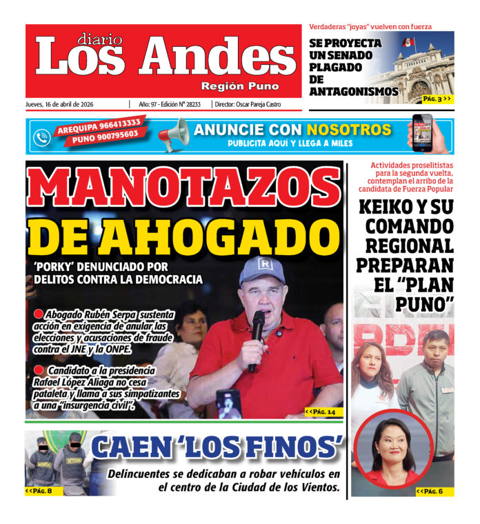 Por: admingeneral Fecha: abril 16, 2026 DIARIO DIGITAL DIARIO LOS ANDES PUNO: 16/04/2026 Vistas: 10 Artículo anteriorDIARIO LOS ANDES AREQUIPA: 16/04/2026 admingeneralhttp://adminlosandes DEJAR UNA RESPUESTA Cancelar respuesta Comentario: Por favor, introduzca su comentario Nombre:* Introduzca aquí su nombre Correo electrónico:* Ha introducido una dirección de correo electrónico incorrecta Introduzca aquí su dirección de correo electrónico Página web: Guarda mi nombre, correo electrónico y sitio web en este navegador para la próxima vez que comente. Compartir post: FacebookTwitterPinterestWhatsApp Suscríbete Quiero entrar He leído y acepto la Política de Privacidad. Populares DIARIO LOS ANDES AREQUIPA: 16/04/2026 Arequipa: Ninguno participó en la sesión solemne por los 37 años del Gobierno Regional Arequipa: Quejas sobre obra en Yanahuara Incautan mercancía de contrabando valorizada en más de S/32 mil en Desaguadero Liberan más de 31 mil alevinos de Carachi en Lagunillas Más vistosMás vistos DIARIO LOS ANDES AREQUIPA: 16/04/2026 admingeneral - abril 16, 2026 Arequipa: Ninguno participó en la sesión solemne por los 37 años del Gobierno Regional admineditor - abril 15, 2026 Redacción: Jean Frisancho Consejeros no asistieron a ceremonia de la... Arequipa: Quejas sobre obra en Yanahuara admineditor - abril 15, 2026 Redacción: Jean Frisancho Cerraron pase peatonal en puente provisional de... Incautan mercancía de contrabando valorizada en más de S/32 mil en Desaguadero admineditor - abril 15, 2026 Un operativo conjunto entre la Policía Nacional del Perú...