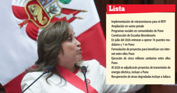 Uno de los anuncios más fue el referido al proyecto de agua y saneamiento en Juliaca, que la mandataria calificó como una de las “grandes obras” de su gestión. “La de Juliaca, en Puno, con una inversión de 1,700 millones de soles, beneficiará a más de 370 mil pobladores”, sostuvo.