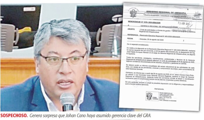 Cuando la Gerencia Regional de Infraestructura a cargo de Fabián Enríquez Mamani comenzaba a caminar con la ejecución de proyectos, tras ocho meses en funciones el gerente general del Gobierno Regional de Arequipa (GRA), Johan Cano Pino, no lo retiró a Enríquez en su puesto, sino que él asumió como nuevo gerente de Infraestructura.