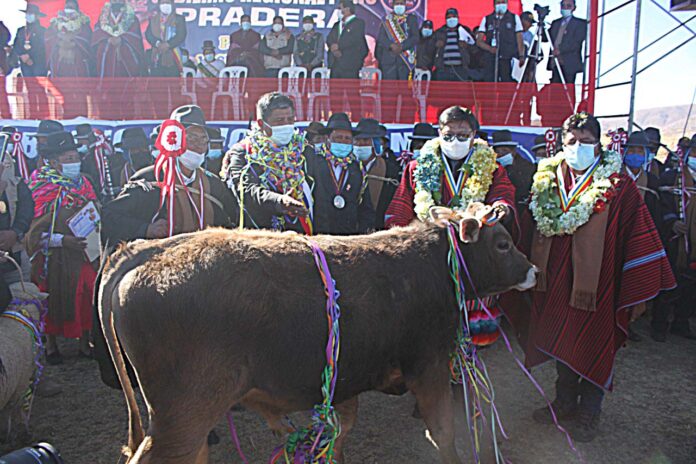 Asimismo, señaló que se pretende mejorar el engorde tradicional realizado por los productores del altiplano y lograr un engorde intensivo estabulado. La ejecución del proyecto durará 4 años y contempla la implementación de un módulo demostrativo (establo) con una capacidad de 30 cabezas de ganado vacuno por asociación o comunidad campesina.