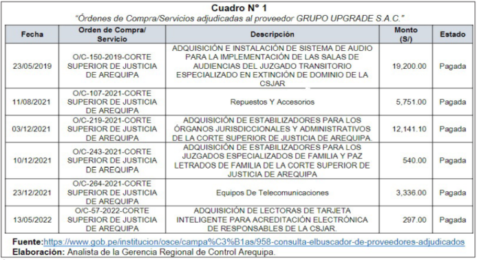 Además de contratar con la Corte Superior de Justicia de Arequipa, la compañía habría suscrito contratos con el Ministerio Público y la Región Policial de Arequipa, según información registrada en el Sistema Electrónico de Contrataciones del Estado (SE@CE) y el Buscador de Proveedores Adjudicados del CONOSCE.