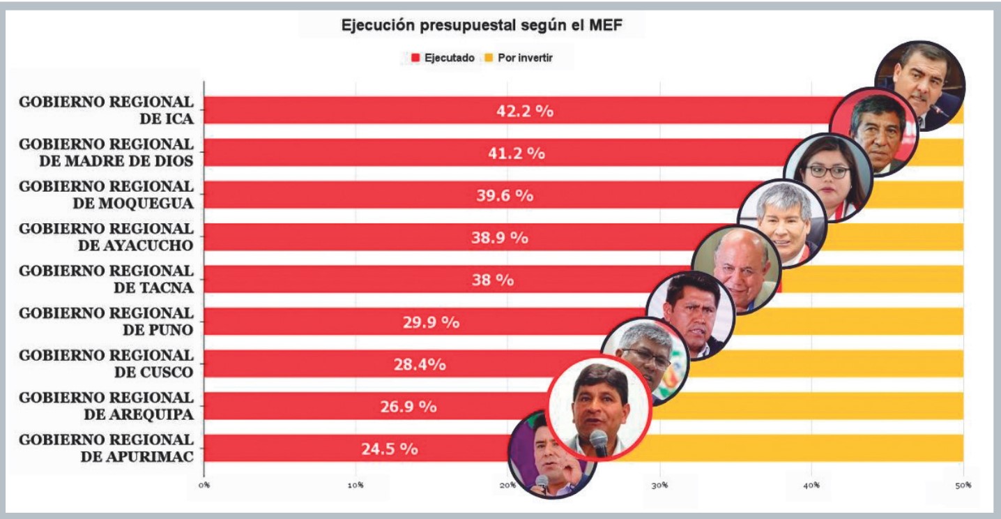 En Cusco, el gobernador Werner Salcedo Álvarez ha logrado un 28.4 % de ejecución, con S/ 270 millones comprometidos de un presupuesto de S/ 954 millones. La diferencia es menor, pero el ritmo de ejecución también es más favorable que en Arequipa. Solo Apurímac registra una ejecución menor. La región, administrada por Percy Godoy Medina, ha alcanzado apenas un 24.5 %, con S/ 100 millones ejecutados de los S/ 411 millones asignados.