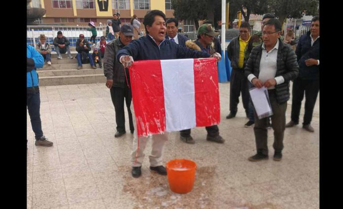 En el marco de las movilizaciones en rechazo al disuelto Congreso de la República, diversos gremios de la ciudad de Juliaca lavaron ayer la bandera nacional.