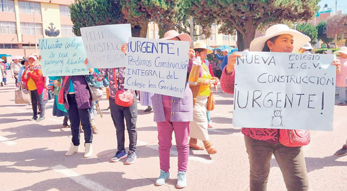Los manifestantes exigen que la promesa de la autoridad se materialice en hechos concretos, ya que el proyecto también fue considerado en el presupuesto participativo. Los padres de familia advirtieron que en cualquier momento las aulas de adobe podrían colapsar.
