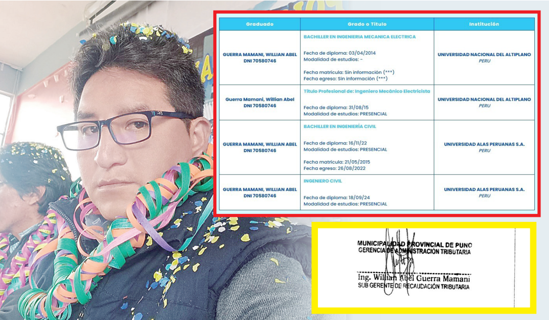 Hurgando entre viejos documentos oficiales, Los Andes encontró que el “ingeniero de siete meses”, Willian Abel Guerra Mamani, efectivamente sí tenía experiencia profesional en una subgerencia… la de administración tributaria de la Municipalidad Provincial de Puno.