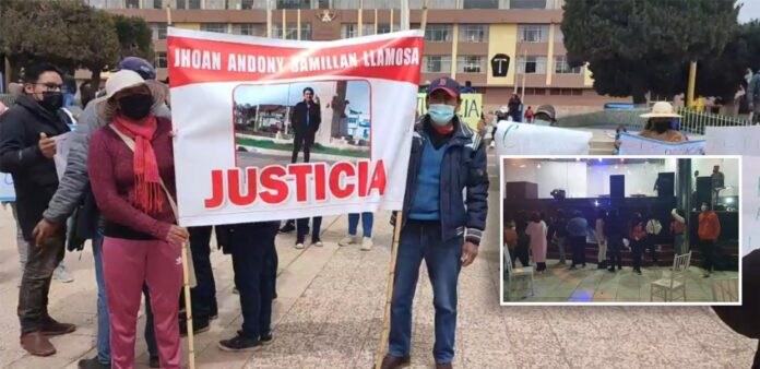 Familiares de un joven identificado como Jhoan Andony Samillan Llamosa (23), quien quedó con severas lesiones al caer del tercer piso de un local de eventos, ayer realizaron una protesta en la plaza de armas de Juliaca, pidiendo justicia.