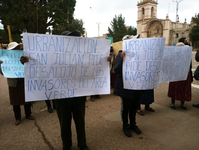 Los vecinos de la urbanización San Julián de la ciudad de Juliaca protestaron al frontis de la municipalidad provincial de San Román, pues esta no hace respetar las áreas de aporte en la zona, las cuales actualmente estarían invadidas por inescrupulosos sujetos.