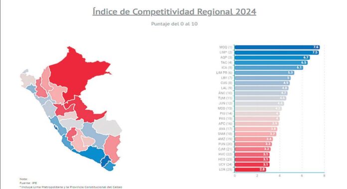 De acuerdo con la 12ª edición del Índice de Competitividad Regional (Incore), elaborado por el Instituto Peruano de Economía (IPE), si bien Puno se mantiene en el puesto 20, registró un peor desempeño en los pilares de Infraestructura, Educación e Instituciones. En el primero, descendió del puesto 23 al 25.
