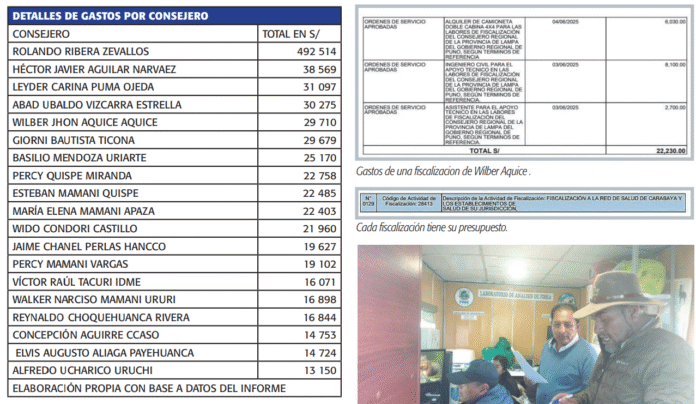 “Por ejemplo, se la paga a un profesional S/ 3 mil soles para 3 o 4 actividades y, en el informe figuran cifras como S/ 500, S/ 200 y así hasta completar el pago completo”, explicaron. Todo bien hasta ahí pero, cuando se revisan los resultados de la fiscalización se encuentran logros como: “ Por ejemplo Jhon Aquice le pagó supuestamente S/ 2 mil 700 a un ingeniero civil, S/ 1 mil 800 a un abogado y S/ 900 a un asistente para fiscalizar la Red de Salud de Lampa.