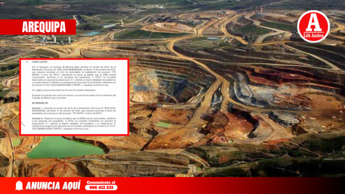 La medida responde a un proceso de revisión iniciado luego de un recurso presentado por la Municipalidad Provincial de Islay. Este cuestionamiento puso en duda la validez del sustento técnico y legal del permiso otorgado en octubre de 2025 a favor de la empresa Southern Peru Copper Corporation.