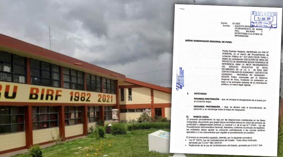 Pricila Ocampo Vázquez presentó una solicitud formal al Gobierno Regional de Puno para revocar la buena pro otorgada al Consorcio Argos en la licitación pública N.º 017-2025-CS/GR Puno-1, valorizada en 390 millones para mejorar la infraestructura de la Institución Educativa Perú BIRF en Azángaro. La principal irregularidad detectada corresponde al Anexo N.º 4 de la documentación presentada, el cual contenía un sello del Consorcio Alfa en lugar del Consorcio Argos.