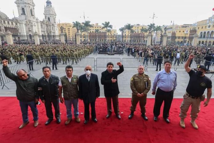 El presidente de la República, Pedro Castillo Terrones se reunió con más de 500 licenciados de las Fuerzas Armadas en el patio de Honor de Palacio de Gobierno. Participó también el Premier Aníbal Torres Vásquez.