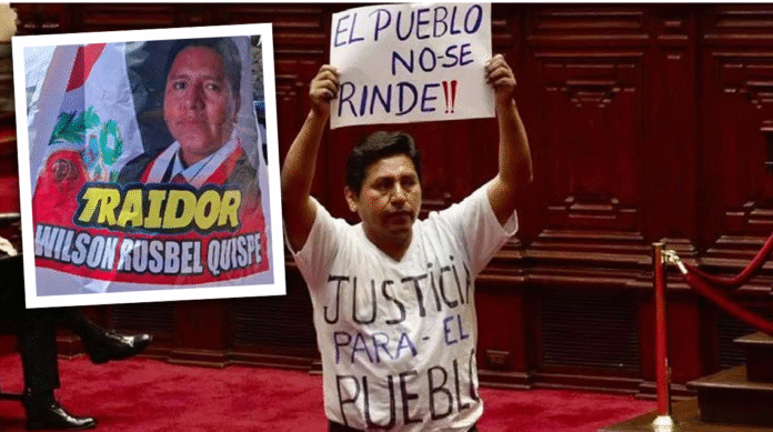Uno de los señalados fue el congresista Wilson Rusbel Quispe Mamani, quien intentó reivindicarse durante el mensaje presidencial de Dina Boluarte en el parlamento, mostrando una pancarta y vistiendo un polo pintado con el mensaje: “Justicia para el pueblo, el pueblo no se rinde”.