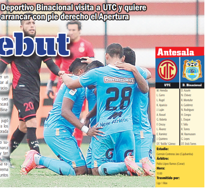 Cajabamba. Llegó la hora de la verdad. Deportivo Binacional esta tarde (15 horas) hace su debut en el Torneo Apertura enfrentando al UTC en el estadio Germán Contreras Jara de la localidad de Cajabamba.