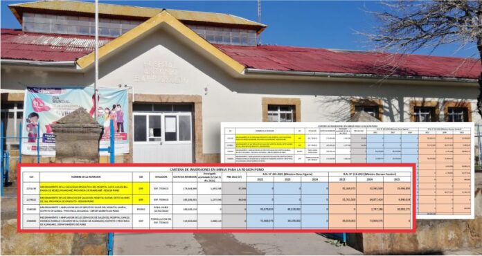 Cabe detallar que los establecimientos de salud afectados son el mejoramiento de los servicios del hospital de Sandia que contaba con un presupuesto de 65 millones 519 mil 481 soles y ahora no tiene nada para el 2023. El segundo establecimiento afectado es el hospital Antonio Barrionuevo de Lampa que proyectaba un presupuesto de 61 millones 831 mil 529 soles. Del mismo modo, el hospital de Yunguyo contaba 83 millones 693 mil 857 soles para el 2023.