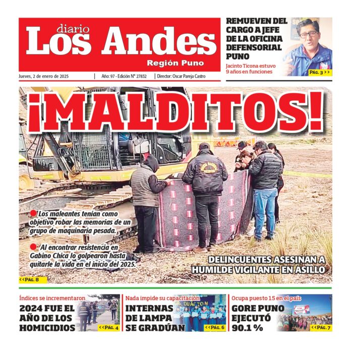 Por: Diario los Andes Fecha: enero 2, 2025 DIARIO DIGITAL PUNO: Diario los Andes 02/01/2025 Vistas: 25 TagsDiario DigitalDiario Los AndesPuno Artículo anteriorAREQUIPA: Diario los Andes 02/01/2025Artículo siguientePUNO: Diario los Andes 03/01/2025 Diario los Andes Compartir post: FacebookTwitterPinterestWhatsApp Suscríbete Quiero entrar He leído y acepto la Política de Privacidad. Populares Crean la Universidad Nacional Tecnológica Intercultural de Pomata Puno: Detectan conexiones clandestinas de aguas residuales Puno: Sereno grave tras ser embestido por combi de empresa “Dorado” Contraloría dispone que regidores y consejeros rindan cuentas Puno: Alianza con dirigentes magisteriales fue clave Más vistosMás vistos Crean la Universidad Nacional Tecnológica Intercultural de Pomata admineditor - abril 14, 2026 En el diario oficial El Peruano, se publicó la... Puno: Detectan conexiones clandestinas de aguas residuales admineditor - abril 14, 2026 La comuna provincial de Puno en coordinación con EMSA... Puno: Sereno grave tras ser embestido por combi de empresa “Dorado” admineditor - abril 14, 2026 Un agente de Serenazgo de la Municipalidad de Puno... Contraloría dispone que regidores y consejeros rindan cuentas admineditor - abril 14, 2026 La Contraloría General de la República dispuso que regidores...