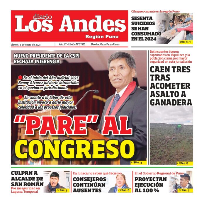 Por: Diario los Andes Fecha: enero 3, 2025 DIARIO DIGITAL PUNO: Diario los Andes 03/01/2025 Vistas: 24 TagsDiario DigitalDiario Los AndesPuno Artículo anteriorPUNO: Diario los Andes 02/01/2025Artículo siguienteAREQUIPA: Diario los Andes 03/01/2025 Diario los Andes Compartir post: FacebookTwitterPinterestWhatsApp Suscríbete Quiero entrar He leído y acepto la Política de Privacidad. Populares Crean la Universidad Nacional Tecnológica Intercultural de Pomata Puno: Detectan conexiones clandestinas de aguas residuales Puno: Sereno grave tras ser embestido por combi de empresa “Dorado” Contraloría dispone que regidores y consejeros rindan cuentas Puno: Alianza con dirigentes magisteriales fue clave Más vistosMás vistos Crean la Universidad Nacional Tecnológica Intercultural de Pomata admineditor - abril 14, 2026 En el diario oficial El Peruano, se publicó la... Puno: Detectan conexiones clandestinas de aguas residuales admineditor - abril 14, 2026 La comuna provincial de Puno en coordinación con EMSA... Puno: Sereno grave tras ser embestido por combi de empresa “Dorado” admineditor - abril 14, 2026 Un agente de Serenazgo de la Municipalidad de Puno... Contraloría dispone que regidores y consejeros rindan cuentas admineditor - abril 14, 2026 La Contraloría General de la República dispuso que regidores...