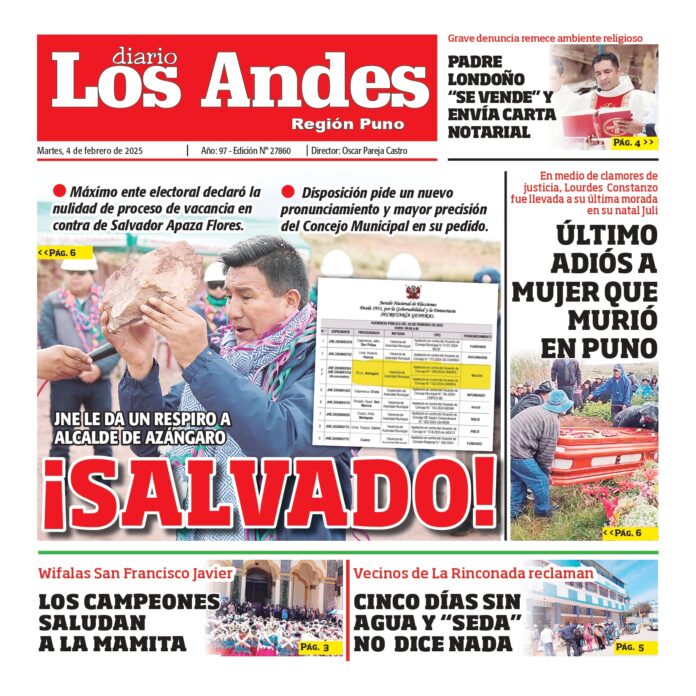 Por: Diario los Andes Fecha: febrero 4, 2025 DIARIO DIGITAL PUNO: Diario los Andes 04/02/2025 Vistas: 30 TagsDiario DigitalDiario Los AndesPuno Artículo anteriorAREQUIPA : Diario los Andes 04/02/2025Artículo siguienteAREQUIPA : Diario los Andes 05/02/2025 Diario los Andes Compartir post: FacebookTwitterPinterestWhatsApp Suscríbete Quiero entrar He leído y acepto la Política de Privacidad. Populares DIARIO LOS ANDES PUNO: 21/04/26 DIARIO LOS ANDES AREQUIPA: 21/04/26 Arequipa: Persecución con disparos deja un detenido y dos heridos Perú suma 20 medallas en los juegos suramericanos de la juventud Panamá 2026 Incautan más de 100 kilos de marihuana en operativo en Cabanillas Más vistosMás vistos DIARIO LOS ANDES PUNO: 21/04/26 admingeneral - abril 21, 2026 DIARIO LOS ANDES AREQUIPA: 21/04/26 admingeneral - abril 21, 2026 Arequipa: Persecución con disparos deja un detenido y dos heridos admineditor - abril 20, 2026 Redacción: Jessimiel Rosas Una persecución policial con disparos se registró... Perú suma 20 medallas en los juegos suramericanos de la juventud Panamá 2026 admineditor - abril 20, 2026 La primera semana de los IV Juegos Suramericanos de...