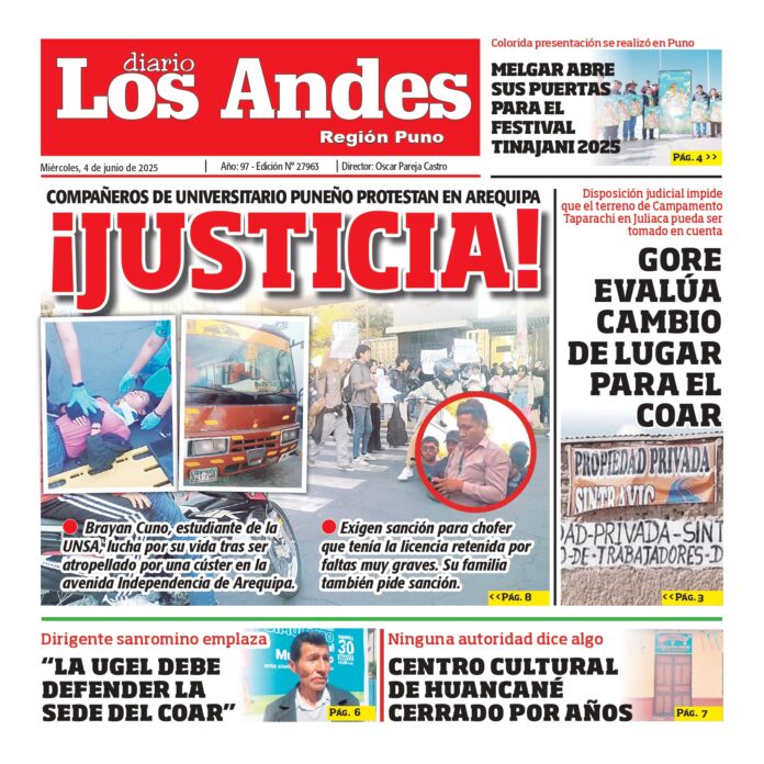 Por: Diario los Andes Fecha: junio 4, 2025 DIARIO DIGITAL PUNO: Diario los Andes 04/06/2025 Vistas: 22 Artículo anteriorAREQUIPA: Diario los Andes 04/06/2025Artículo siguienteAREQUIPA: Diario los Andes 05/06/2025 Diario los Andes Compartir post: FacebookTwitterPinterestWhatsApp Suscríbete Quiero entrar He leído y acepto la Política de Privacidad. Populares Arequipa: A clases virtuales por paro del SIT Tránsito libre en Arequipa y costo del pasaje sin control Puno: Obrero fallece al caer de cuarto piso en la urbanización Simón Bolívar Juliaca: Grifos acaparan combustible pero ellos aseguran escasez Juliaca: Retiran propaganda electoral instalados en áreas verdes de la ciudad Más vistosMás vistos Arequipa: A clases virtuales por paro del SIT Diario los Andes - marzo 12, 2026 Redacción: Thais Astoquilca Rivera A solo tres días del inicio... Tránsito libre en Arequipa y costo del pasaje sin control Diario los Andes - marzo 12, 2026 Redacción: Julissa Aquino Insostenible. La crisis en el transporte público... Puno: Obrero fallece al caer de cuarto piso en la urbanización Simón Bolívar Diario los Andes - marzo 12, 2026 Redacción: Javier Calderón Un trágico accidente laboral enluta a una... Juliaca: Grifos acaparan combustible pero ellos aseguran escasez Diario los Andes - marzo 12, 2026 Redacción: Reynaldo Puma La fiscal de Prevención del Delito, Marifé...