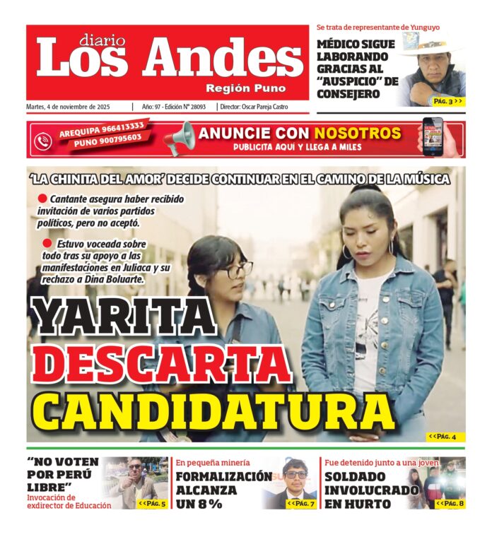 Por: Diario los Andes Fecha: noviembre 4, 2025 DIARIO DIGITAL PUNO: Diario Los Andes 04/11/2025 Vistas: 105 Artículo anteriorAREQUIPA: Diario Los Andes 04/11/2025Artículo siguienteAREQUIPA: Diario Los Andes 05/11/2025 Diario los Andes Compartir post: FacebookTwitterPinterestWhatsApp Suscríbete Quiero entrar He leído y acepto la Política de Privacidad. Populares DIRESA Puno recibe más de 300 mil vacunas contra el sarampión Aprueban proyecto de ordenanza para incorporar enfermeros en colegios ONPE admite olvido de cajas con cédulas de sufragio en vehículo de traslado Choque frontal en la vía Pucará-Ayaviri deja un fallecido y tres heridos Dan viabilidad a propuesta de Área de Conservación Regional Allincápac Más vistosMás vistos DIRESA Puno recibe más de 300 mil vacunas contra el sarampión admineditor - abril 17, 2026 La mañana de este 17 de abril, la Dirección... Aprueban proyecto de ordenanza para incorporar enfermeros en colegios admineditor - abril 17, 2026 El Consejo Regional aprobó un proyecto de ordenanza que... ONPE admite olvido de cajas con cédulas de sufragio en vehículo de traslado admineditor - abril 17, 2026 A través de un comunicado, la Oficina Nacional de... Choque frontal en la vía Pucará-Ayaviri deja un fallecido y tres heridos admineditor - abril 17, 2026 Un accidente de tránsito ocurrido al promediar la medianoche...
