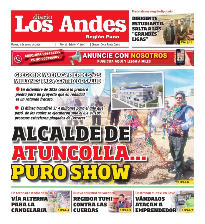 Por: Diario los Andes Fecha: enero 6, 2026 DIARIO DIGITAL PUNO: Diario Los Andes 06/01/2026 Vistas: 209 Artículo anteriorAREQUIPA: Diario Los Andes 06/01/2026Artículo siguienteAREQUIPA: Diario Los Andes 07/01/2026 Diario los Andes Compartir post: FacebookTwitterPinterestWhatsApp Suscríbete Quiero entrar He leído y acepto la Política de Privacidad. Populares Seguridad en Arequipa limitada por falta de vehículos y agentes policiales Arequipa: Cobran hasta S/1.50 pese a tarifa oficial de S/1.30 en el SIT Arequipa: Actividades de Semana Santa comienzan con Vía Crucis en la Plaza de Armas Lima: Asesinan a candidato Gilbert Infante en Chorrillos tras semanas de amenazas Hallan restos de bebé en descampado de Socabaya y presumen ataque de perros Más vistosMás vistos Seguridad en Arequipa limitada por falta de vehículos y agentes policiales Diario los Andes - marzo 25, 2026 La región Arequipa enfrenta limitaciones en su capacidad de... Arequipa: Cobran hasta S/1.50 pese a tarifa oficial de S/1.30 en el SIT Diario los Andes - marzo 25, 2026 La Municipalidad Provincial de Arequipa oficializó desde hoy el... Arequipa: Actividades de Semana Santa comienzan con Vía Crucis en la Plaza de Armas Diario los Andes - marzo 25, 2026 La ciudad de Arequipa dará inicio a las celebraciones... Lima: Asesinan a candidato Gilbert Infante en Chorrillos tras semanas de amenazas Diario los Andes - marzo 25, 2026 Redacción: Yudith Veronica Taco Huallpa El candidato a diputado Gilbert...
