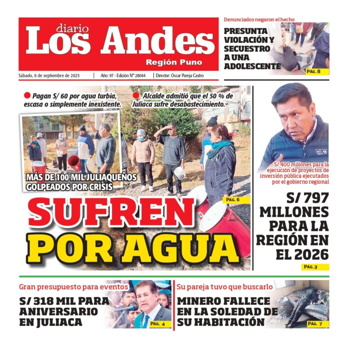 Por: Diario los Andes Fecha: septiembre 6, 2025 DIARIO DIGITAL PUNO: Diario Los Andes 06/09/2025 Vistas: 40 TagsDiario DigitalDiario Los AndesPuno Artículo anteriorAREQUIPA: Diario Los Andes 06/09/2025Artículo siguientePUNO: Diario Los Andes 07/09/2025 Diario los Andes Compartir post: FacebookTwitterPinterestWhatsApp Suscríbete Quiero entrar He leído y acepto la Política de Privacidad. Populares Puno: Buscaron la reelección y se estrellaron con la valla Puno: Consejeros vuelven sin pena, ni gloria Puno: Anuncian marcha por fraude DIARIO LOS ANDES PUNO: 15/04/2026 DIARIO LOS ANDES AREQUIPA: 15/04/2026 Más vistosMás vistos Puno: Buscaron la reelección y se estrellaron con la valla admineditor - abril 15, 2026 Los congresista por Puno que intentaron reelegirse en las... Puno: Consejeros vuelven sin pena, ni gloria admineditor - abril 15, 2026 Esta semana se reincorporan a sus labores como consejeros... Puno: Anuncian marcha por fraude admineditor - abril 15, 2026 Fernando Salas convocó en Puno una movilización contra un... DIARIO LOS ANDES PUNO: 15/04/2026 admingeneral - abril 15, 2026