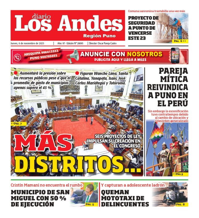 Por: Diario los Andes Fecha: noviembre 6, 2025 DIARIO DIGITAL PUNO: Diario Los Andes 06/11/2025 Vistas: 105 TagsDiario DigitalDiario Los AndesPuno Artículo anteriorAREQUIPA: Diario Los Andes 06/11/2025Artículo siguienteAREQUIPA: Diario Los Andes 07/11/2025 Diario los Andes Compartir post: FacebookTwitterPinterestWhatsApp Suscríbete Quiero entrar He leído y acepto la Política de Privacidad. Populares DIARIO LOS ANDES AREQUIPA: 26/04/26 DIARIO LOS ANDES PUNO: 26/04/26 Arequipa: Ambulantes persisten en San Camilo pese a operativos municipales Arequipa: Detienen a presunto estafador por venta de cerveza adulterada Atlético Grau y Alianza Atlético enfrentan duros retos en la fecha 12 del Apertura Más vistosMás vistos DIARIO LOS ANDES AREQUIPA: 26/04/26 admingeneral - abril 25, 2026 DIARIO LOS ANDES PUNO: 26/04/26 admingeneral - abril 25, 2026 Arequipa: Ambulantes persisten en San Camilo pese a operativos municipales admineditor - abril 25, 2026 El comercio informal sigue presente en los alrededores del... Arequipa: Detienen a presunto estafador por venta de cerveza adulterada admineditor - abril 25, 2026 Redacción: Jessimiel Rosas Agentes de la unidad de Halcones de...