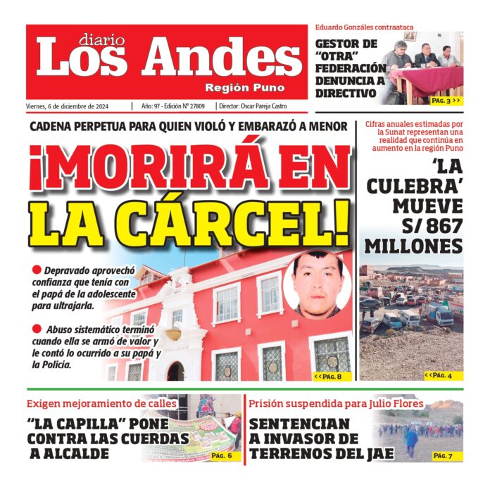Por: Diario los Andes Fecha: diciembre 6, 2024 DIARIO DIGITAL PUNO: Diario los Andes 06/12/2024 Vistas: 14 TagsDiario DigitalDiario Los AndesPuno Artículo anteriorPUNO: Diario los Andes 05/12/2024Artículo siguienteAREQUIPA: Diario los Andes 06/12/2024 Diario los Andes Compartir post: FacebookTwitterPinterestWhatsApp Suscríbete Quiero entrar He leído y acepto la Política de Privacidad. Populares Crean la Universidad Nacional Tecnológica Intercultural de Pomata Puno: Detectan conexiones clandestinas de aguas residuales Puno: Sereno grave tras ser embestido por combi de empresa “Dorado” Contraloría dispone que regidores y consejeros rindan cuentas Puno: Alianza con dirigentes magisteriales fue clave Más vistosMás vistos Crean la Universidad Nacional Tecnológica Intercultural de Pomata admineditor - abril 14, 2026 En el diario oficial El Peruano, se publicó la... Puno: Detectan conexiones clandestinas de aguas residuales admineditor - abril 14, 2026 La comuna provincial de Puno en coordinación con EMSA... Puno: Sereno grave tras ser embestido por combi de empresa “Dorado” admineditor - abril 14, 2026 Un agente de Serenazgo de la Municipalidad de Puno... Contraloría dispone que regidores y consejeros rindan cuentas admineditor - abril 14, 2026 La Contraloría General de la República dispuso que regidores...