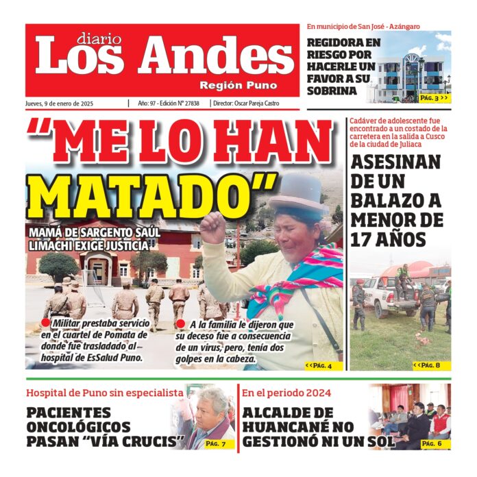 Por: Diario los Andes Fecha: enero 9, 2025 DIARIO DIGITAL PUNO: Diario los Andes 09/01/2025 Vistas: 26 TagsDiario DigitalDiario Los AndesPuno Artículo anteriorAREQUIPA: Diario los Andes 09/01/2025Artículo siguienteAREQUIPA: Diario los Andes 10/01/2025 Diario los Andes Compartir post: FacebookTwitterPinterestWhatsApp Suscríbete Quiero entrar He leído y acepto la Política de Privacidad. Populares Arequipa: Ninguno participó en la sesión solemne por los 37 años del Gobierno Regional Arequipa: Quejas sobre obra en Yanahuara Incautan mercancía de contrabando valorizada en más de S/32 mil en Desaguadero Liberan más de 31 mil alevinos de Carachi en Lagunillas COER alerta lluvias en provincias del norte de la región Puno Más vistosMás vistos Arequipa: Ninguno participó en la sesión solemne por los 37 años del Gobierno Regional admineditor - abril 15, 2026 Redacción: Jean Frisancho Consejeros no asistieron a ceremonia de la... Arequipa: Quejas sobre obra en Yanahuara admineditor - abril 15, 2026 Redacción: Jean Frisancho Cerraron pase peatonal en puente provisional de... Incautan mercancía de contrabando valorizada en más de S/32 mil en Desaguadero admineditor - abril 15, 2026 Un operativo conjunto entre la Policía Nacional del Perú... Liberan más de 31 mil alevinos de Carachi en Lagunillas admineditor - abril 15, 2026 Un total de 31 mil 800 alevinos de carachi...