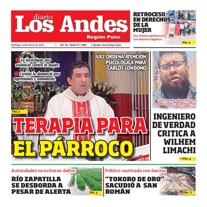 Por: Diario los Andes Fecha: marzo 9, 2025 DIARIO DIGITAL PUNO : Diario los Andes 09/03/2025 Vistas: 23 Artículo anteriorAREQUIPA : Diario los Andes 09/03/2025Artículo siguienteSemanario Los Andes 10/03/2025 Diario los Andes Compartir post: FacebookTwitterPinterestWhatsApp Suscríbete Quiero entrar He leído y acepto la Política de Privacidad. Populares Puno: Policía apoya en descolmatación de viviendas afectadas por huacico en San Gabán Puno: Madre y su bebé caen de combi en movimiento Puno: Denuncian pregunta usurpación ilegal de explanada del cerro Huaynarroque JNE deja fuera de carrera a lista de Libertad Popular en Arequipa Carretera Arequipa- La Joya cobra otra víctima: cantero muere tras ser atropellado Más vistosMás vistos Puno: Policía apoya en descolmatación de viviendas afectadas por huacico en San Gabán Diario los Andes - febrero 11, 2026 Redacción: Diario Los Andes Efectivos de la Policía Nacional... Puno: Madre y su bebé caen de combi en movimiento Diario los Andes - febrero 11, 2026 Redacción: Diario Los Andes Un grave accidente ocurrido en... Puno: Denuncian pregunta usurpación ilegal de explanada del cerro Huaynarroque Diario los Andes - febrero 11, 2026 Redacción: Diario Los Andes La Municipalidad Provincial de San Román... JNE deja fuera de carrera a lista de Libertad Popular en Arequipa Diario los Andes - febrero 11, 2026 Redacción: Diario Los Andes La lista de candidatos a...