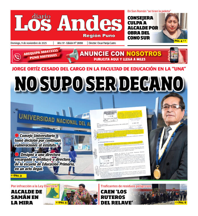 Por: Diario los Andes Fecha: noviembre 8, 2025 DIARIO DIGITAL PUNO: Diario Los Andes 09/11/2025 Vistas: 67 Artículo anteriorPUNO: Diario Los Andes 08/11/2025Artículo siguienteAREQUIPA: Diario Los Andes 09/11/2025 Diario los Andes Compartir post: FacebookTwitterPinterestWhatsApp Suscríbete Quiero entrar He leído y acepto la Política de Privacidad. Populares DIARIO LOS ANDES AREQUIPA: 26/04/26 DIARIO LOS ANDES PUNO: 26/04/26 Arequipa: Ambulantes persisten en San Camilo pese a operativos municipales Arequipa: Detienen a presunto estafador por venta de cerveza adulterada Atlético Grau y Alianza Atlético enfrentan duros retos en la fecha 12 del Apertura Más vistosMás vistos DIARIO LOS ANDES AREQUIPA: 26/04/26 admingeneral - abril 25, 2026 DIARIO LOS ANDES PUNO: 26/04/26 admingeneral - abril 25, 2026 Arequipa: Ambulantes persisten en San Camilo pese a operativos municipales admineditor - abril 25, 2026 El comercio informal sigue presente en los alrededores del... Arequipa: Detienen a presunto estafador por venta de cerveza adulterada admineditor - abril 25, 2026 Redacción: Jessimiel Rosas Agentes de la unidad de Halcones de...