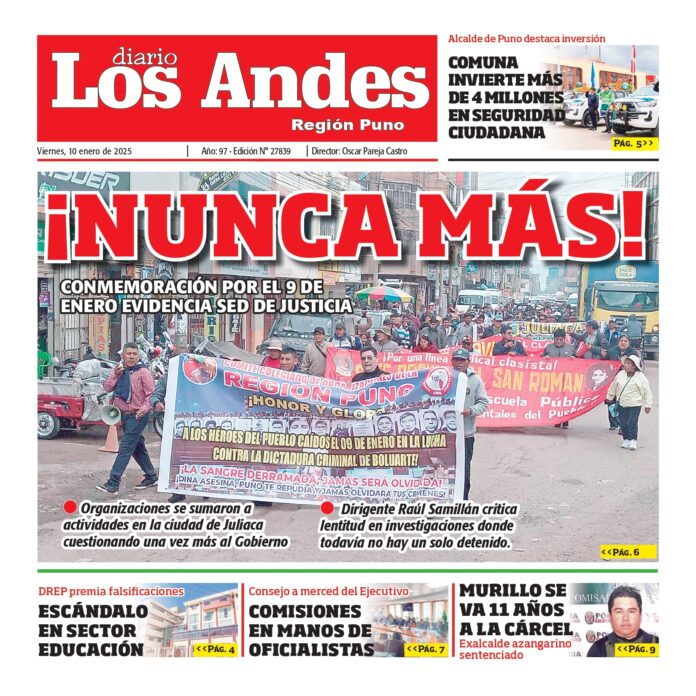 Por: Diario los Andes Fecha: enero 10, 2025 DIARIO DIGITAL PUNO: Diario los Andes 10/01/2025 Vistas: 51 TagsDiario DigitalDiario Los AndesPuno Artículo anteriorAREQUIPA: Diario los Andes 10/01/2025Artículo siguienteAREQUIPA: Diario los Andes 11/01/2025 Diario los Andes Compartir post: FacebookTwitterPinterestWhatsApp Suscríbete Quiero entrar He leído y acepto la Política de Privacidad. Populares DIARIO LOS ANDES PUNO: 16/04/2026 DIARIO LOS ANDES AREQUIPA: 16/04/2026 Arequipa: Ninguno participó en la sesión solemne por los 37 años del Gobierno Regional Arequipa: Quejas sobre obra en Yanahuara Incautan mercancía de contrabando valorizada en más de S/32 mil en Desaguadero Más vistosMás vistos DIARIO LOS ANDES PUNO: 16/04/2026 admingeneral - abril 16, 2026 DIARIO LOS ANDES AREQUIPA: 16/04/2026 admingeneral - abril 16, 2026 Arequipa: Ninguno participó en la sesión solemne por los 37 años del Gobierno Regional admineditor - abril 15, 2026 Redacción: Jean Frisancho Consejeros no asistieron a ceremonia de la... Arequipa: Quejas sobre obra en Yanahuara admineditor - abril 15, 2026 Redacción: Jean Frisancho Cerraron pase peatonal en puente provisional de...