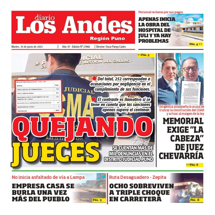 Por: Diario los Andes Fecha: junio 9, 2025 DIARIO DIGITAL PUNO: Diario los Andes 10/06/2025 Vistas: 63 TagsDiario DigitalDiario Los AndesPuno Artículo anteriorAREQUPA: Diario los Andes 10/06/2025Artículo siguienteAREQUIPA: Diario los Andes 11/06/20 Diario los Andes Compartir post: FacebookTwitterPinterestWhatsApp Suscríbete Quiero entrar He leído y acepto la Política de Privacidad. Populares Arequipa: Padre encuentra a su hijo desaparecido en la calle tras un mes de búsqueda Investigan presunta red de corrupción en el Municipio de Puno Ejecutarán acondicionamiento térmico en 10 colegios de la región UGEL San Román expone a los niños al sarampión Aimaras claman por indulto para Aduviri Más vistosMás vistos Arequipa: Padre encuentra a su hijo desaparecido en la calle tras un mes de búsqueda admineditor - abril 22, 2026 Redacción: Jessimiel Rosas Un padre encontró a su hijo desaparecido... Investigan presunta red de corrupción en el Municipio de Puno admineditor - abril 22, 2026 La Fiscalía Provincial Especializada en Delitos de Corrupción de... Ejecutarán acondicionamiento térmico en 10 colegios de la región admineditor - abril 22, 2026 El Programa Nacional de Infraestructura Educativa (Pronied), ejecutará intervenciones... UGEL San Román expone a los niños al sarampión admineditor - abril 22, 2026 Director parece ignorar los 32 casos que se han...